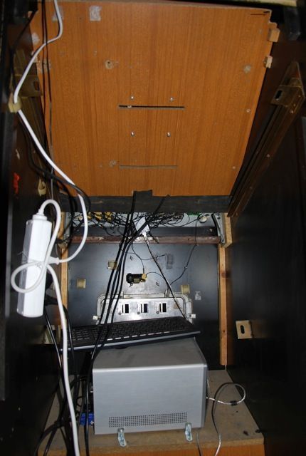 L'ordinateur est installé dans la trape derrière la facade du monnayeur, avec un clavier et une souris.