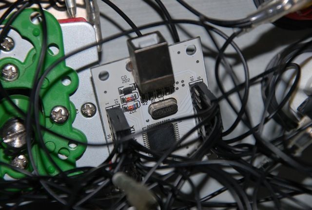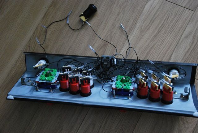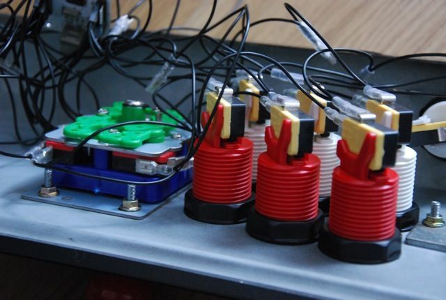 Chaque switch est relié par un cable à l'interface joysticks-boutons/USB (en gros plan sur la 3e photo).