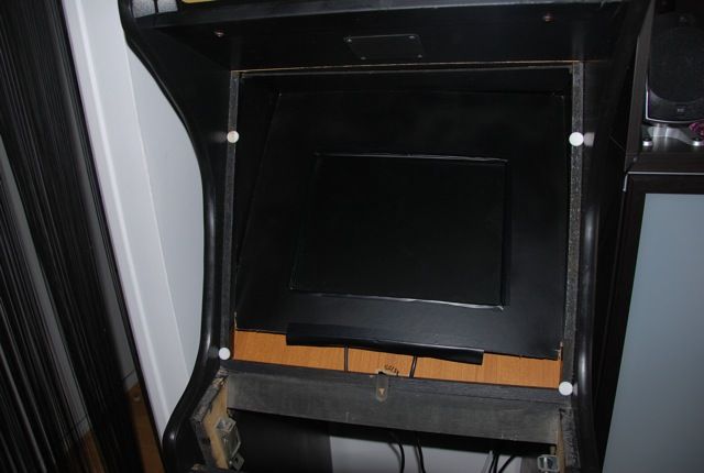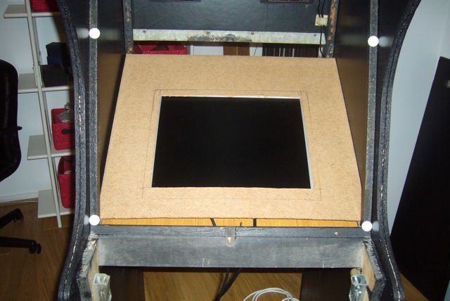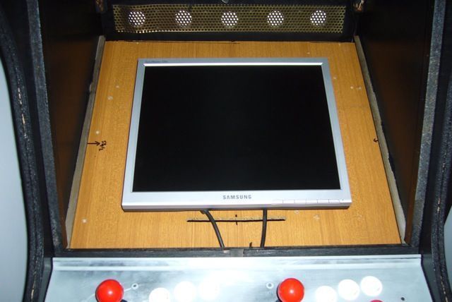 Pour l'écran je récupére tout simplement une planche à l'intérieur de la borne. Je scie la planche pour la mettre aux bonnes dimensions. Je perce 4 trous pour fixer l'écran à l'aide de vis (juste derrière l'écran TFT).